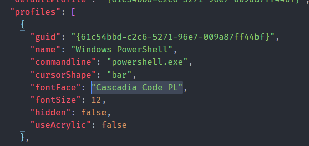 Lastly, update the fontFace property your Windows Terminal profile to use the newly installed font.