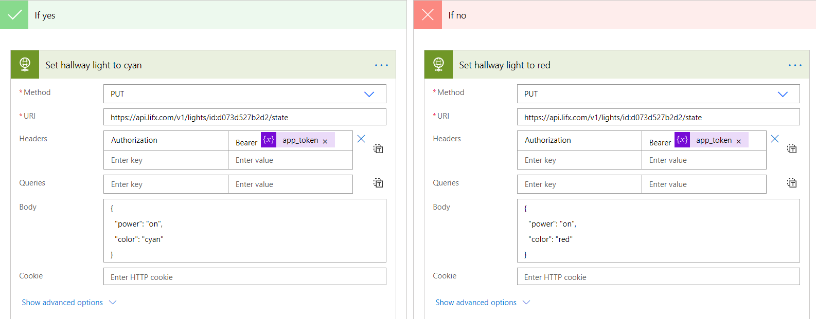 Now we just need to replicate the HTTP post we created earlier, but substituting the colour for the appropriate value. In this example, if the subject is “Focus time” I want the light to turn blue, or if it’s not (i. e. anything else) it’ll turn red.